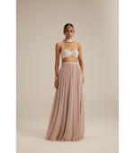 DESCRIPTIONAsh Pink Skirt, paired with a mirror and pearl embroidered halter-neck blouse and a stole with cascading pearl tassels. FABRIC USEDBlouse -GeorgetteSkirt– GeorgetteDupatta – Georgette COMPONENTSBlouseSkirtDupatta COLOURAsh Pink EMBROIDERYWhite DISCLAIMER: The colour...