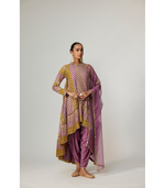 A vibrant multicolor kurta in deep beige, mud mauve, green tones, adorned with golden gota embroidery, paired with a scattered sequins dhoti and dupatta set FABRICKurta – GeorgetteInner – CrepePants...