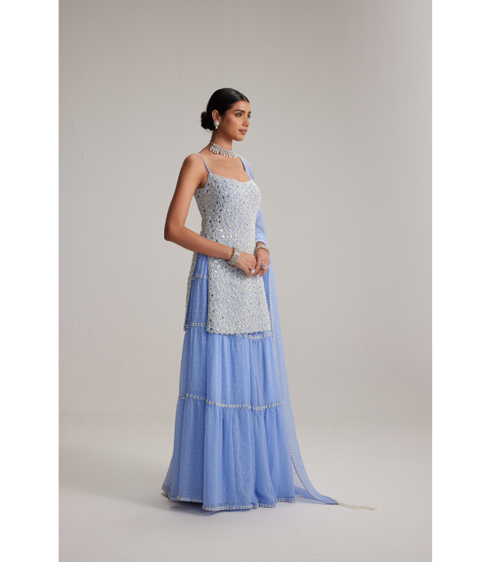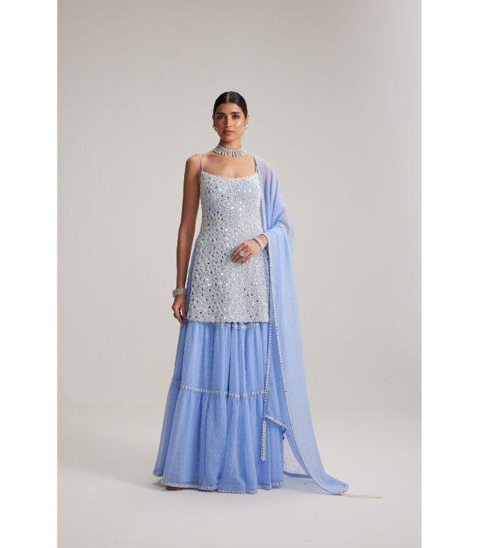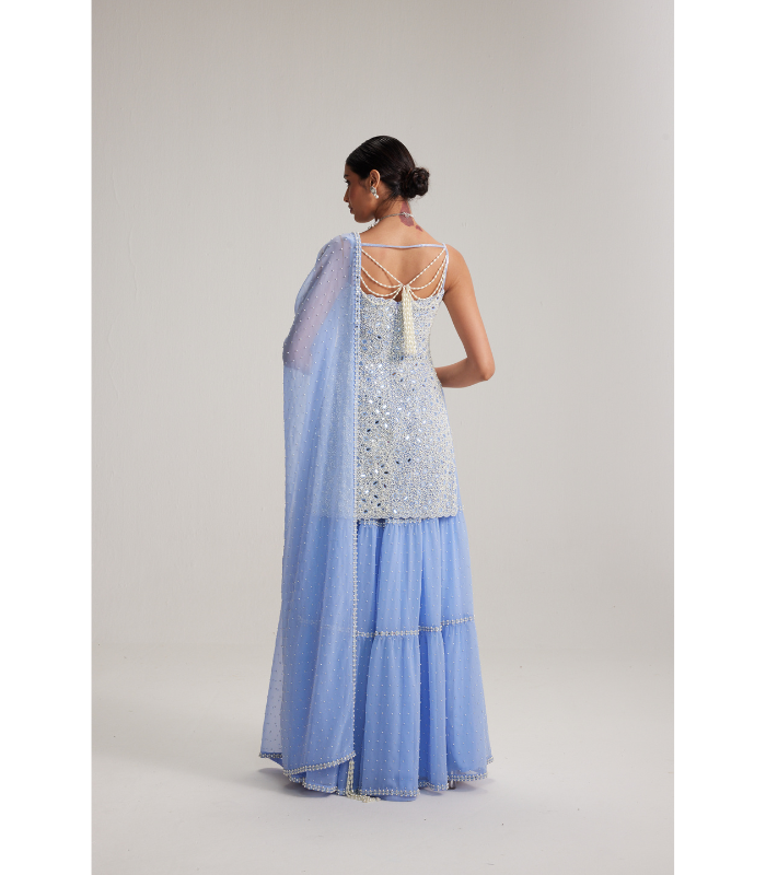 Dew Blue Mirror and Pearl embroidered Kurta paired with Sharara and Dupatta.