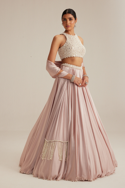 Pink Kite Georgette Printed Embroidered Bustier With Tropical Dupion Silk Printed Embroidered Lehenga And A Pink Mukaish Net Dupatta With Tassels