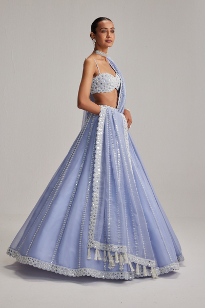 Powder Blue Velvet Embroidered Choli With A Velvet Basque Organza Skirt And Mukaish Net Dupatta