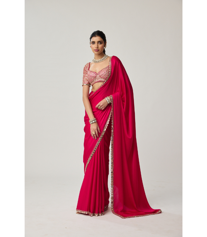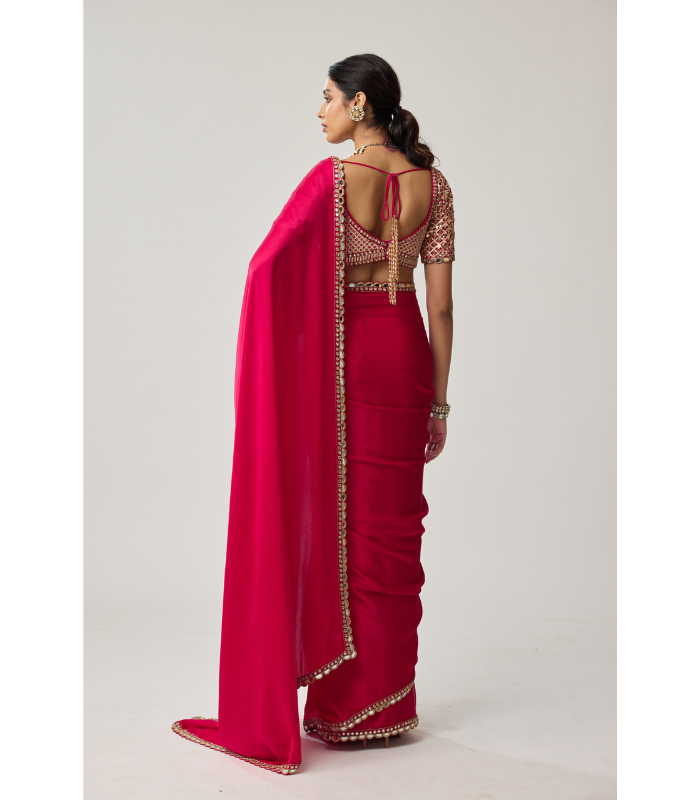 Crimson Red Gota Mirror hand embroidered Satin Saree clubbed with real hand cut mirror embroidered Elbow sleeve blouse.