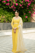 Anarkali embellished with mirror and sequins work paired with a mirror embroidered dupatta.