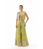 The ensemble features a beautifully crafted sleeveless kurti adorned with intricate embroidery lending a regal touch to the outfit. The matching sharara pants are gracefully flared and detailed with complementary embroidery at the hem, creating a balanced and eye-catching silhouette. Paired with a delicate dupatta embellished with motifs and a detailed border.