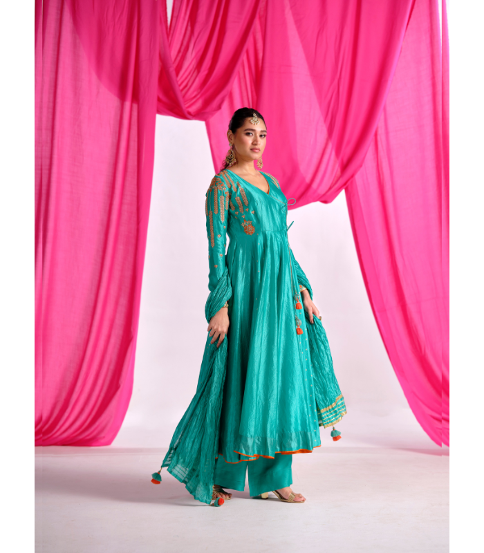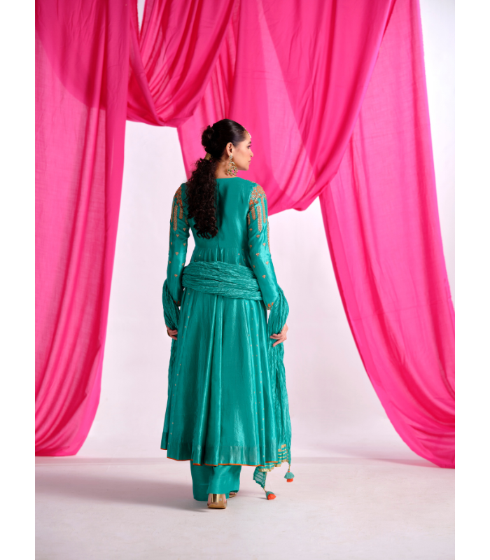 Teal Green Floral Kurti Set in Organza silk.