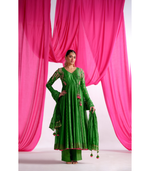 A set featuring a silk fabric top paired with a flat silk bottom and a silk dupatta. The intricate Gota, thread, and Aari work lend a regal charm to this ensemble.