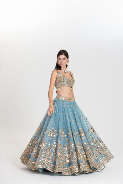 Fabric Description:- SKIRT-SPECIAL ORGANZA ,DUPATTA-SPECIAL ORGANZA , BLOUSE- SPECIAL CHANDERI Embroidery Details:- MIRROR,ZARI,DORI THREAD , SEQUINS Colour Options :- Colours can be customizedColor :- BlueAvailability :- Custom Make OrdersNo. Of Components :- 3Washing care :- Dry clean...