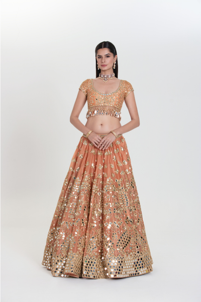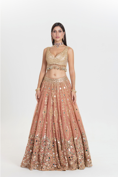 Fabric Description:- SKIRT-SPECIAL NET ,DUPATTA-SPECIAL ORGANZA , BLOUSE- SPECIAL CHANDERI Embroidery Details:- MIRROR,ZARI,DORI THREAD , SEQUINS Color Options :- Colours can be customizedColor :- Blush Peach Availability :- Custom Make OrdersNo. Of Components :- 3Washing care :- Dry...
