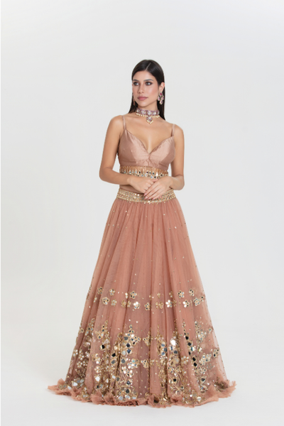 Fabric Description:- SKIRT-SPECIAL NET ,DUPATTA-SPECIAL ORGANZA , BLOUSE- SPECIAL CHANDERI Embroidery Details:- MIRROR,ZARI,DORI THREAD , SEQUINS Color Options :- Colours can be customizedColor :- CaramelAvailability :- Custom Make OrdersNo. Of Components :- 3Washing care :- Dry clean...