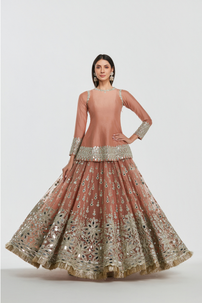 Fabric Description - Peplum - Special Silk , Lehenga - Special Net , Dupatta - Special Net Embroidery - Mirror work , zari , gota Colour:- Peach Salmon No. Of...