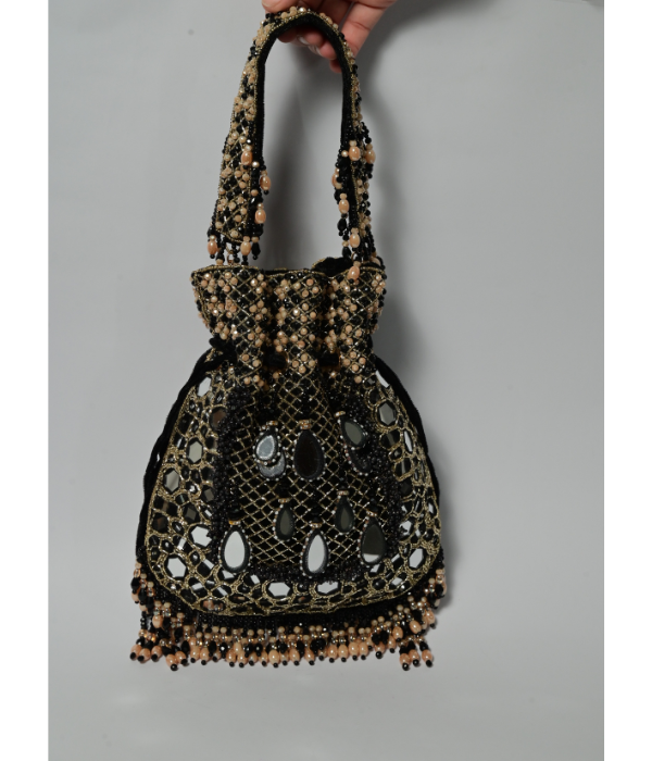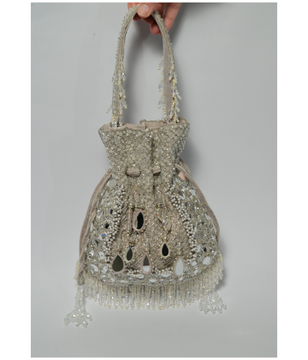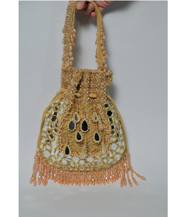 Elevate your ethnic ensemble with our exquisite handmade potli bag, crafted in elegant colours and adorned with intricate mirror work. The reflective mirrors add a subtle sparkle.