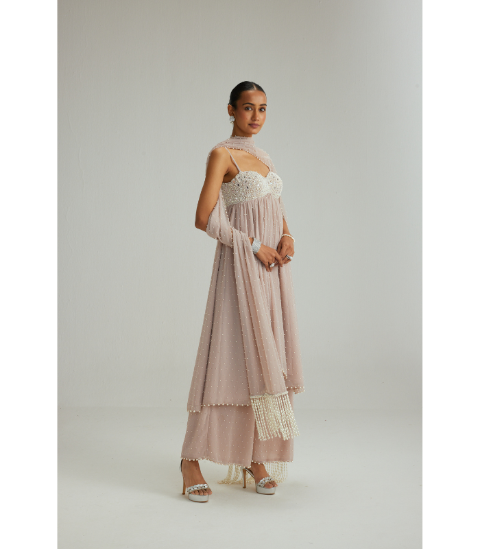 DESCRIPTION Ash Pink Mirror and Pearl Asymmetrical Kurta set with paired with pants and Dupatta. FABRIC USED Kurta– Georgette Pants – Georgette Dupatta- Georgette COMPONENTS Kurta Pants Dupatta COLOUR Ash pink EMBROIDERY White DISCLAIMER: The colour might slightly vary from the images