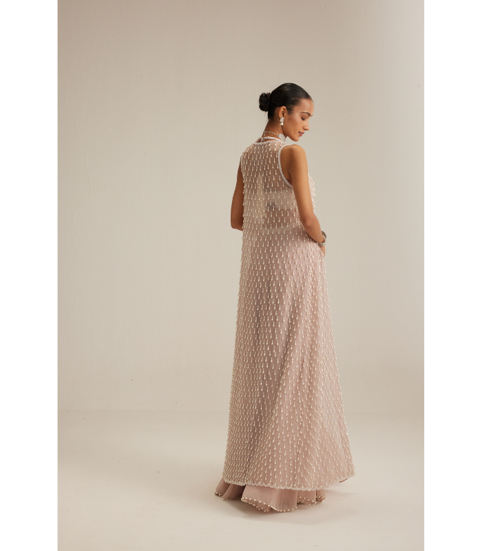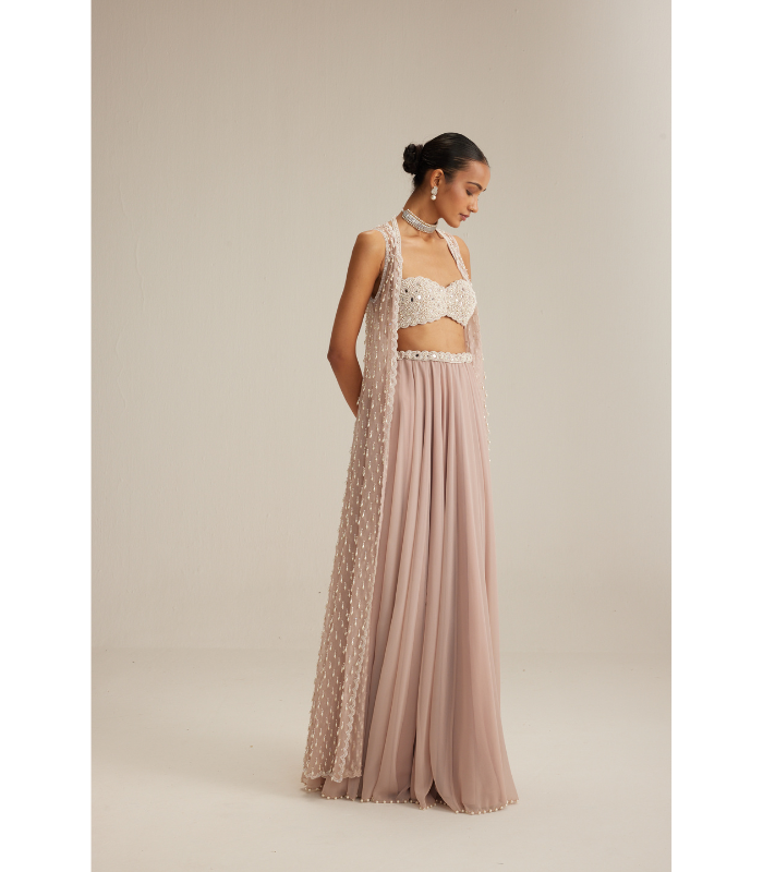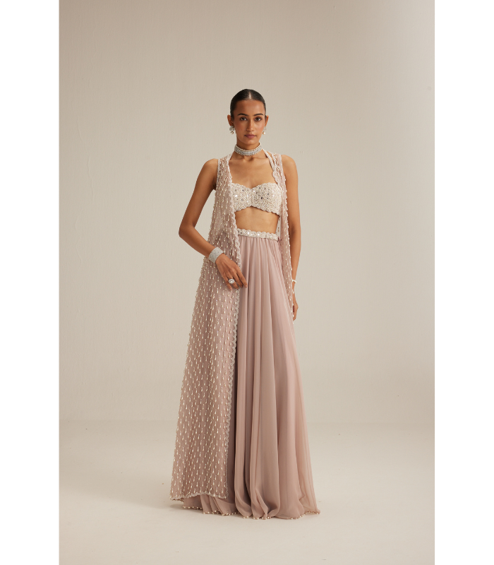 DESCRIPTIONAsh Pink Jacket adorned with mirror and pearl embroidery and cascading pearl tassels, paired with a heavily embroidered blouse and skirt.