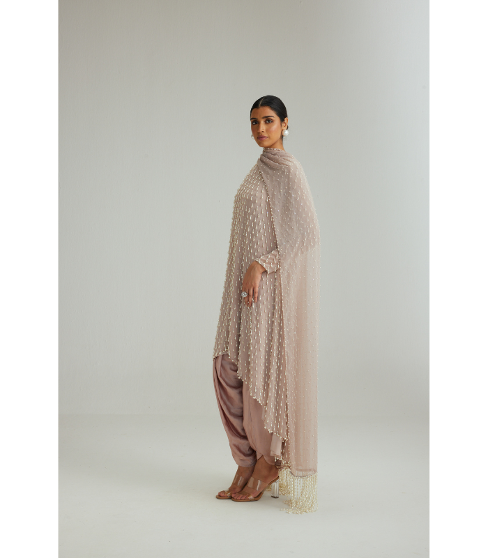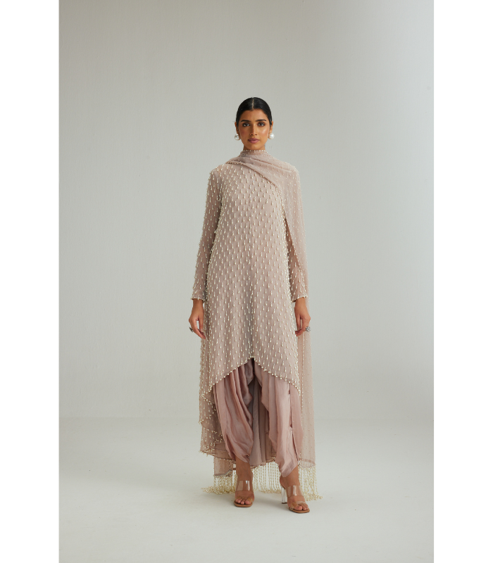 DESCRIPTIONAsh Pink Pearl Drop Kurta set with paired with dhoti pants and Dupatta.FABRIC USEDKurta– GeorgettePants – crepeInner- CrepeDupatta- GeorgetteCOMPONENTSKurtaInnerPantsDupattaCOLOURAsh pinkEMBROIDERYWhite