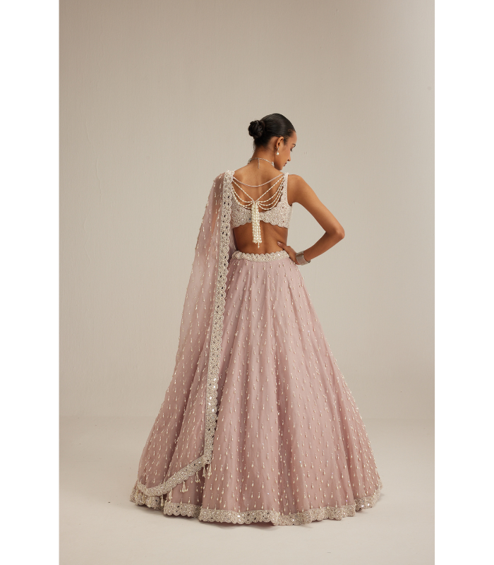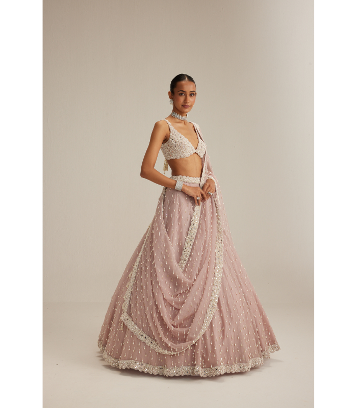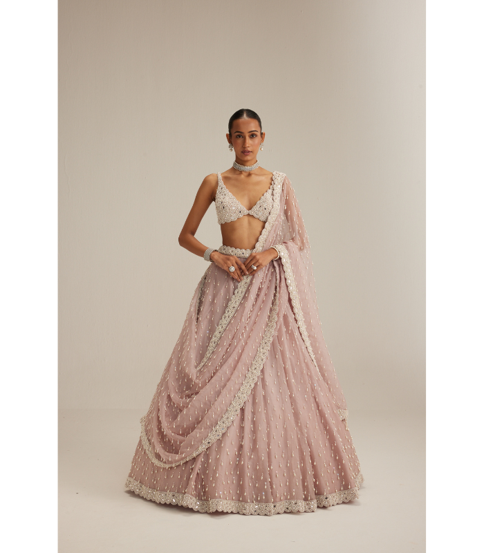 DESCRIPTIONAsh Pink Pearl Drop Organza Lehenga, paired with a heavily embroidered V-neck blouse and a dupatta.
