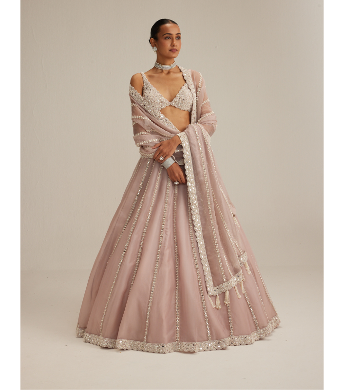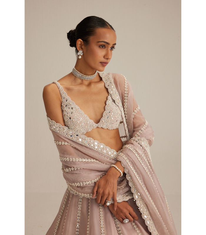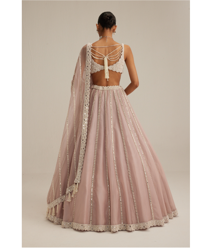 DESCRIPTION Ash Pink Linear Mirror and Pearl Embroidered Organza Lehenga, paired with a heavily embroidered V-neck blouse and a dupatta with cascading pearl tassels.
