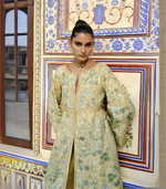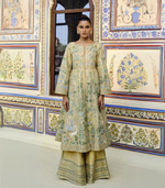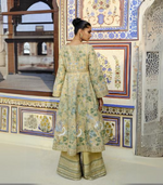 An exquisite jacket set wit gharara pants feature hand-painted Pichhwai motifs of lush tropics, further embellished with pearl embroidery and sequins.