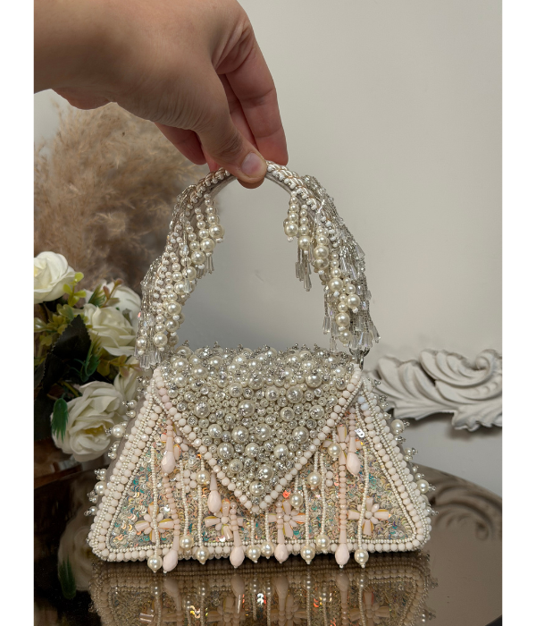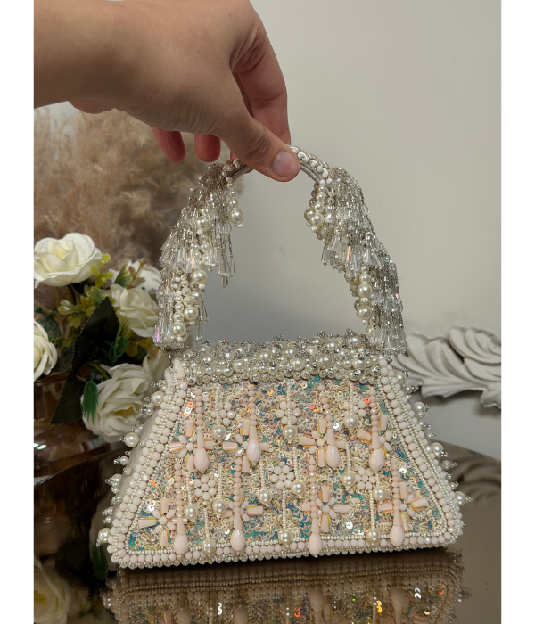 Intricate Beadwork: A beautiful cascade of white pearls and shimmering silver-toned beads. Luxurious Texture: Delicate sequin patterns woven into a high-quality fabric base, providing a subtle shimmer and tactile appeal. Unique Structure: A distinct structured shape that blends traditional "Potli" design elements with modern clutch functionality.