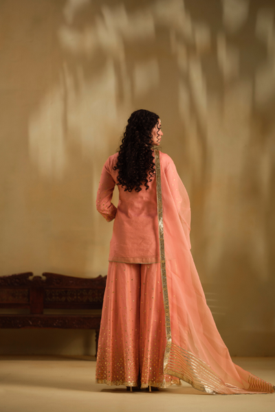This set includes a short kurta, sharara, and dupatta in Peach Chanderi tissue with Gota work. The dupatta is finished with a lumpi border. Components: 3 Work: Gota CARE INSTRUCTIONS-...