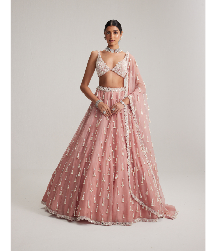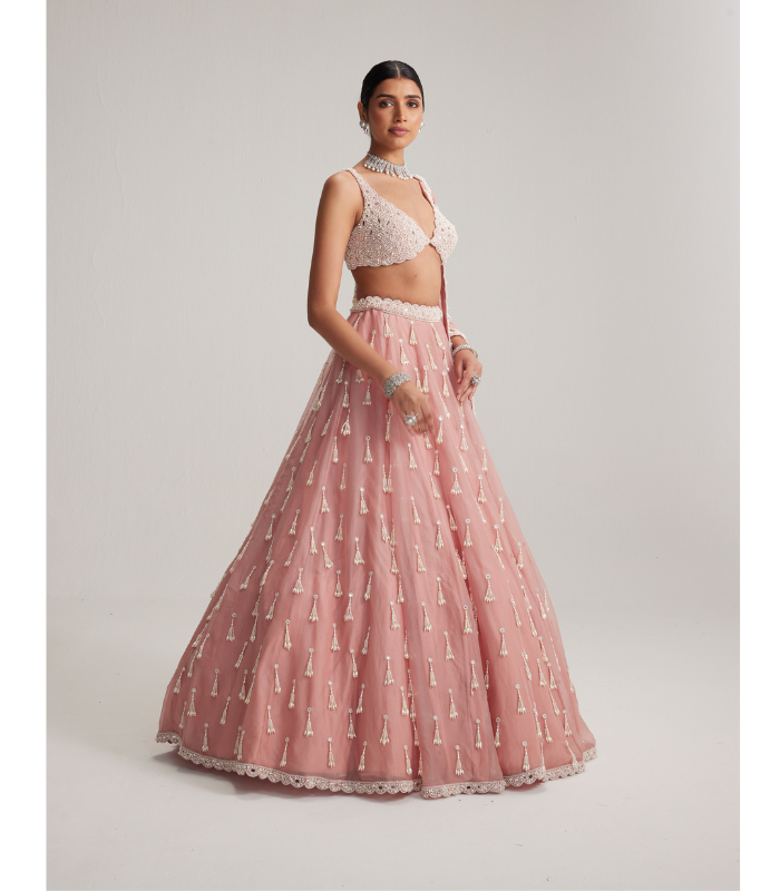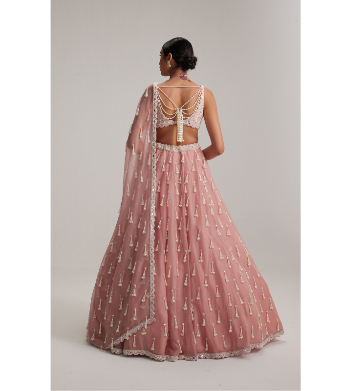 DESCRIPTIONDusty Rose Organza mirror and pearl tassels lehenga set, paired with a heavily embroidered V neck blouse and dupatta .