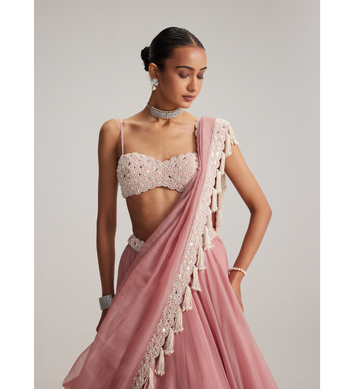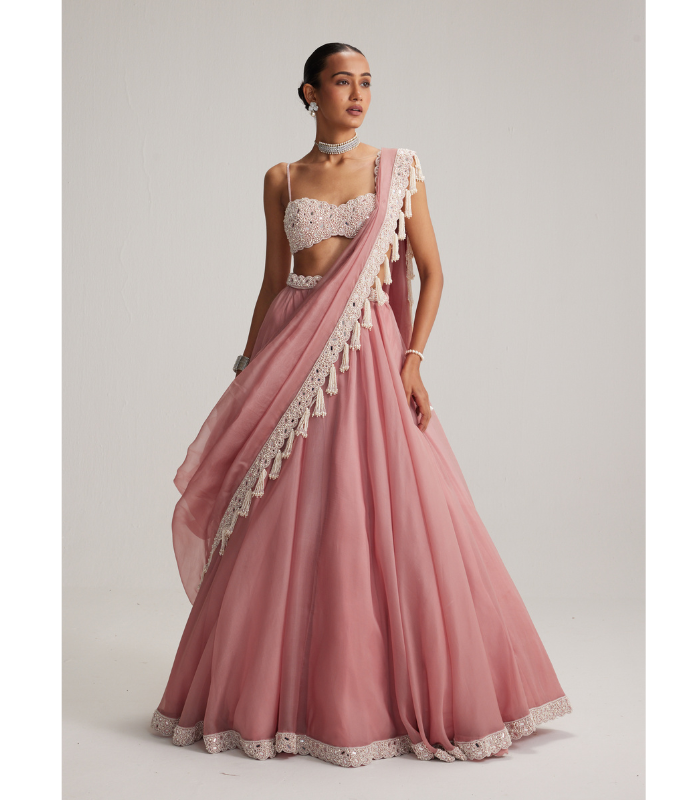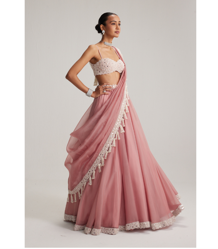 DESCRIPTIONDusty Rose Organza mirror and pearl lehenga set, paired with a heavily embroidered blouse and dupatta with Cascading tassels .
