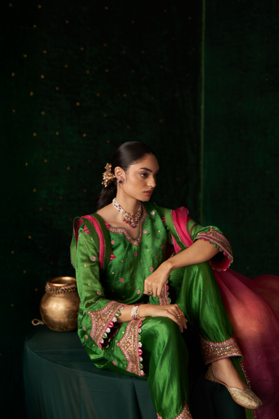 This graceful outfit pairs a silk fabric top with a flat silk bottom and an organza dupatta. The intricate Gota, thread, and Aari work on the top and dupatta elevate...