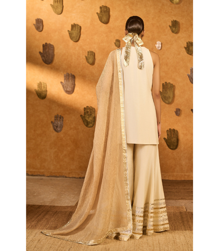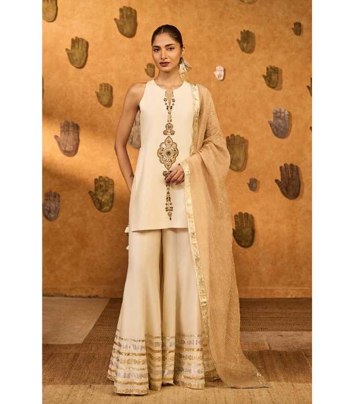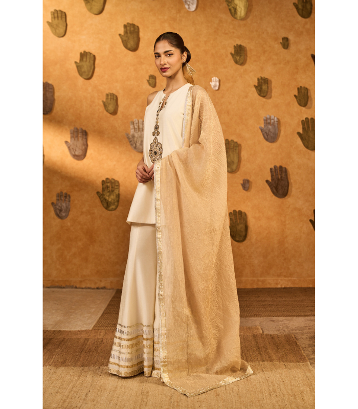Details: This ivory sharara set is crafted in luxurious raw silk, exuding quiet sophistication through its minimalist yet impactful design. The sleeveless kurta features a central front slit and is embellished with a vertical panel of intricate embroidery in gold and jewel-toned accents, creating a regal focal point. A high side slit on the kurta, finished with felicate tassels, adds a playful yet graceful accent. Paired with a subtly flared sharara, the look maintains a delicate balance between statement and restraint. Completing the ensemble is a sheer Banarasi tissue dupatta with soft gold and silver foil highlights, adding fluidity and a touch of ethereal charm to the modern silhouette.