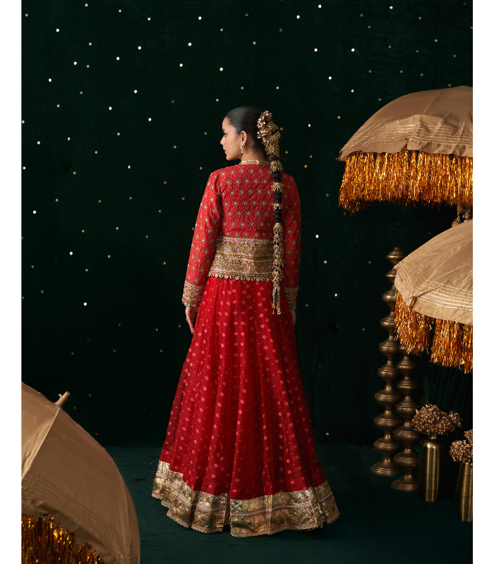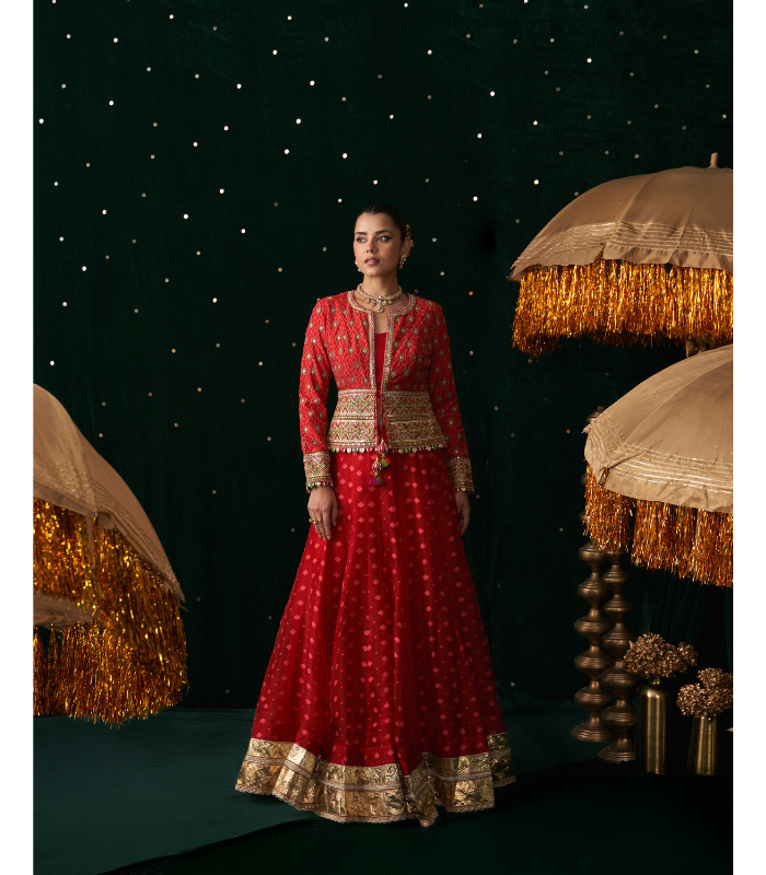 This striking red ensemble is a blend of timeless tradition and contemporary elegance. It includes a rich organza jacquard lehenga featuring subtle golden woven motifs and a regal gold zari brocade border. The set comes with a matching red inner blouse for comfort and structure, topped with a short jacket beautifully adorned in intricate multicolor thread embroidery, mirror work, and zari highlights. The jacket is finished with handcrafted tassels at the tie-up for a festive flair.