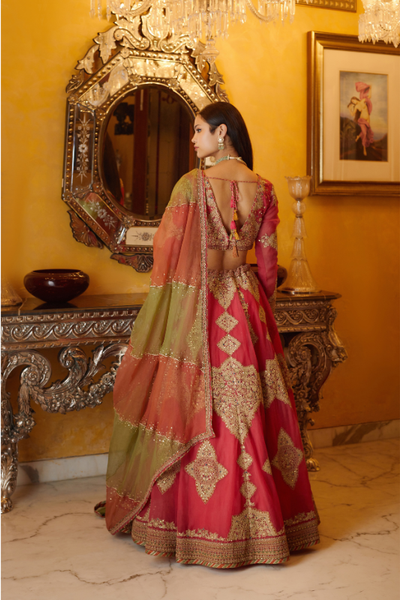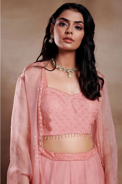 FLOWERS BEADS ORGANZA LEHENGA WITH JACKET AND BLOUSE Color : Dark Pink Fabric : ORGANZA Embroidery Details : Hand Embroidery no of components - 3 Delivery Time : 5-6 weeks Wash Care : Dry...