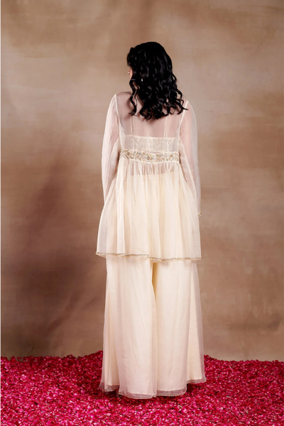 EMBROIDERED BLOUSE WITH ORGANZA JACKET AND ELEGANT ORGANZA PANTS . Color : IVORY Fabric : ORGANZA Embroidery Details : Hand Embroidery no of components - 3 Delivery Time : 4 - 5 weeks Wash...