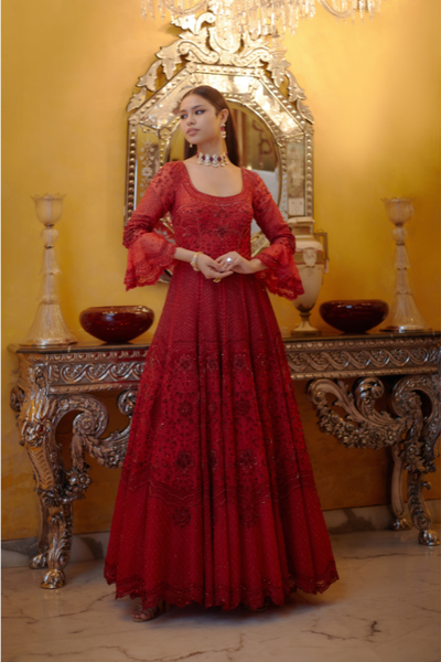 Red gown with maroon and red embroidery work and intricate artwork detailing with embroidered of cutdana, dabka, Swarovski stones, beads, sequins. Color: Scarlet Fabric: Silk Organza no of components - 2 Delivery...