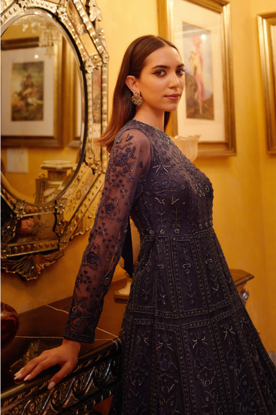 Midnight blue gown with beautiful floral and geometrical artwork and work done with resham, Swarovski stone, cutdana, sequins Color: Midnight Blue Fabric: Silk Organza no of components - 1 Delivery Time: 3-4 weeks...