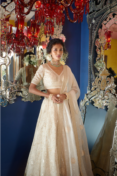 Lehenga work inspired by the mandala art for the artwork same as the brand logo with cord embroidery and sequins and Swarovski work to glitterise. Color: Pearl Fabric: Silk Organza No of...