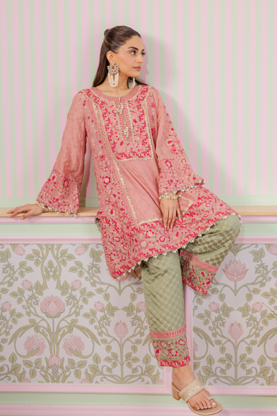 DESCRIPTION- Drenched in elegance and old-world charm, this blush pink and soft green set is a graceful pick for intimate wedding functions or a dreamy daytime soiree. The kurta features exquisite...