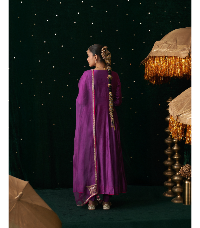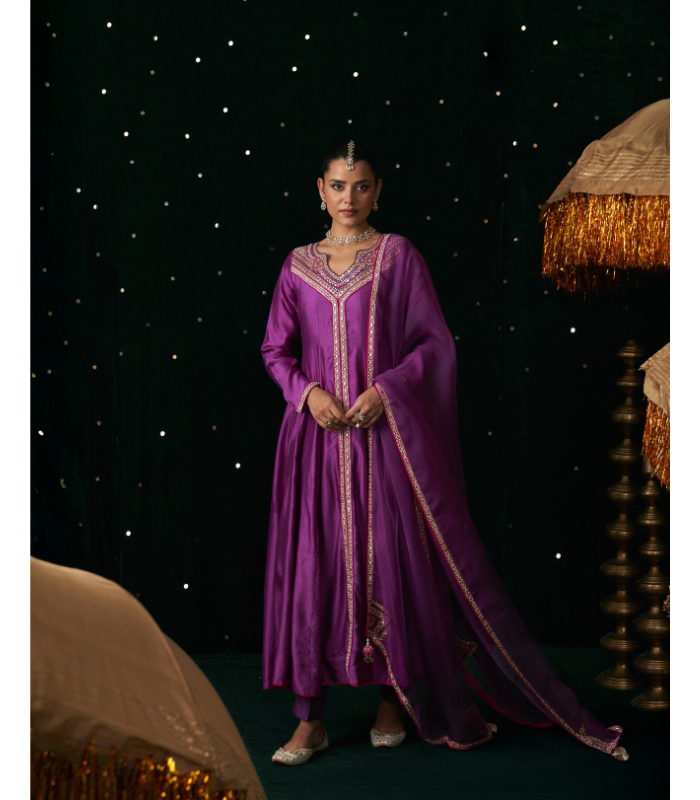 Mauve ensemble exuding timeless elegance, this look features a classic Anarkali set in luxurious silk. The kurta is richly embellished with intricate gota patti and threadwork. The flowy silhouette is paired with straight silk pants and a matching Organza dupatta with hand embroidered border.
