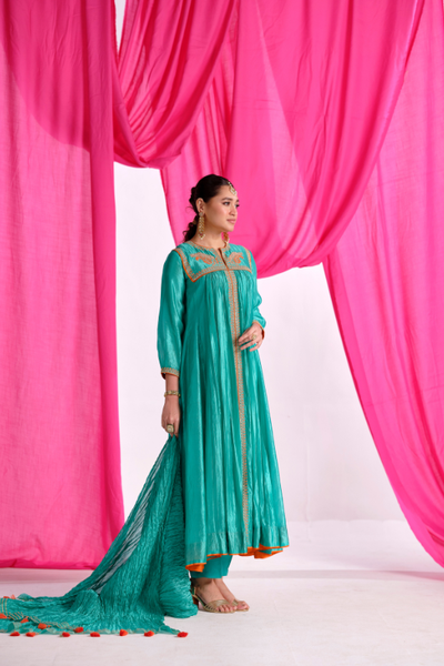 A refined set featuring a silk fabric top and bottom, paired with an organza dupatta. The detailed Gota, thread, and Aari work add a luxurious finish to this classic ensemble.Components:...