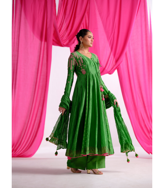 A set featuring a silk fabric top paired with a flat silk bottom and a silk dupatta. The intricate Gota, thread, and Aari work lend a regal charm to this ensemble.