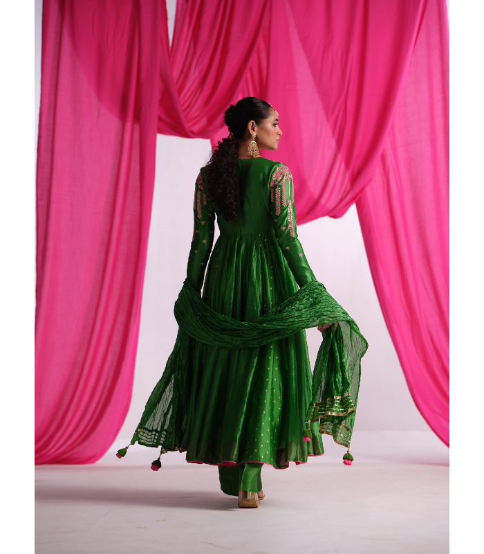 Fabric:Top: SilkBottom: Flat SilkDupatta: SilkWork: Gota, Thread, Aari Work