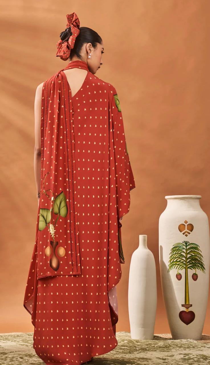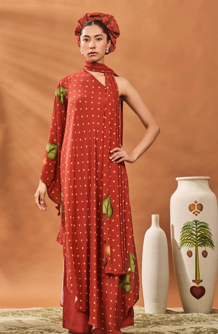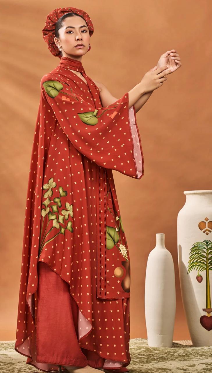 All over printed asymmetrical tunic with tulip sleeves , embellished with crochet borders Pant