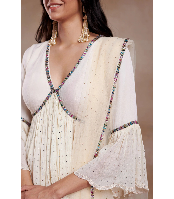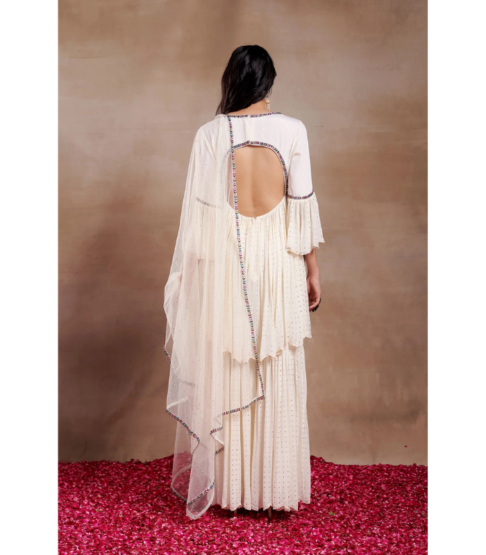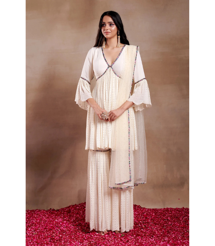 LIGHT FLAYERD CHINNON PEPLUM WITH MININAL EMROIDERED SHARARA AND AN ELEGANT DUPATTA