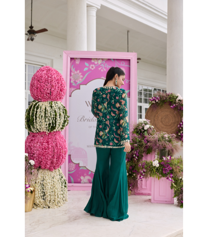 Fabric : Printed Georgette, Habotai Silk, Satin LiningEmbroidery : Hand workColor : Emerald GreenNo. Of Components : 2Care : Dry Clean OnlyDelivery Time : 3-4 weeks