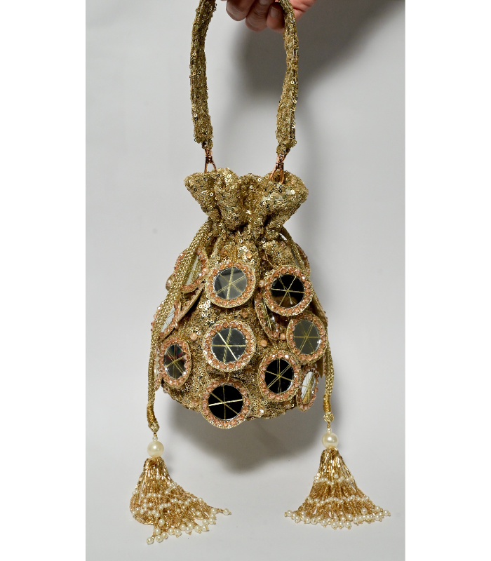 Introducing our exquisite handmade potli from the " Sheeshmahal Collection " —the intricate mirrorwork and grandeur of ancient palace corridors, this potli is meticulously hand embellished with shimmering sequins, delicate beadwork, and stunning mirror accents that catch the light from every angle.
