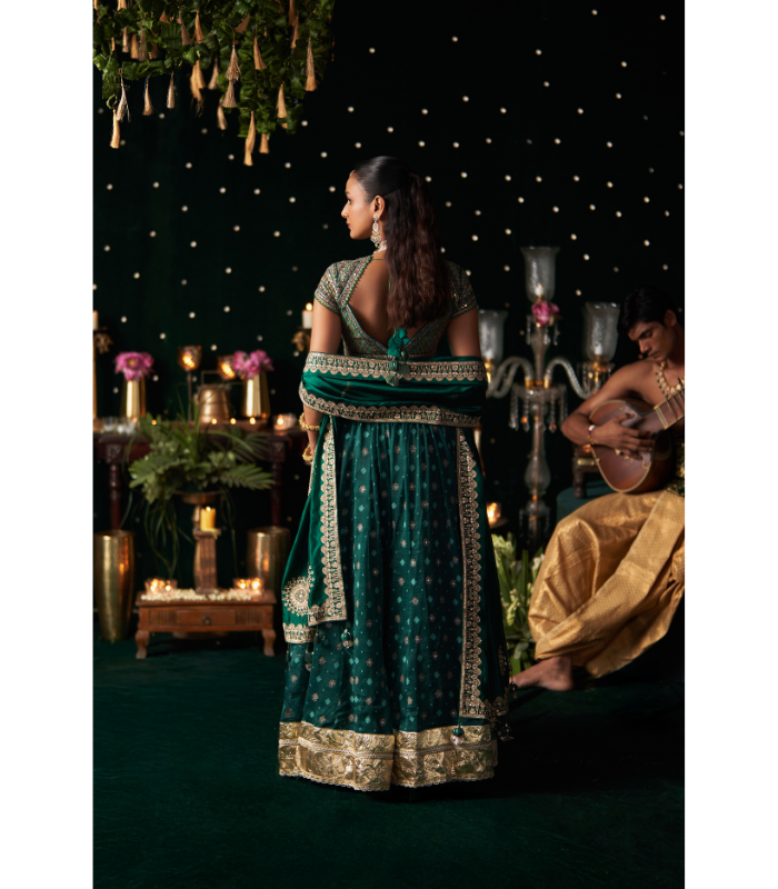 A regal deep teal lehenga set that captures timeless charm and traditional grace. The lehenga is crafted in lightweight organza, adorned with delicate foil butti motifs and finished with a rich golden zari embroidered border. The blouse is made of intricately woven ikkat silk, featuring multicolored thread embroidery and sequin highlights for added opulence. Completing the ensemble is a beautifully bordered silk dupatta, bringing structure and richness to the flowing silhouette.