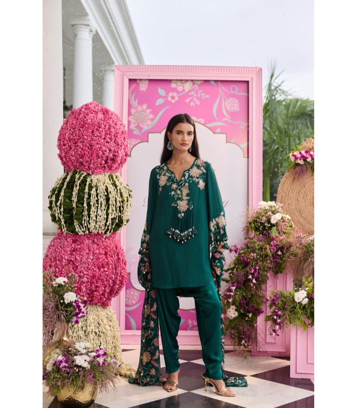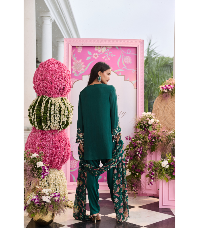 Fabric : Habutai Silk, Satin, Printed Organza, Satin Lining Embroidery : Hand work & Machine work Color : Emerald Green No. Of Components : 3 Care : Dry Clean Only Delivery Time : 3-4 weeks
