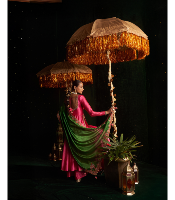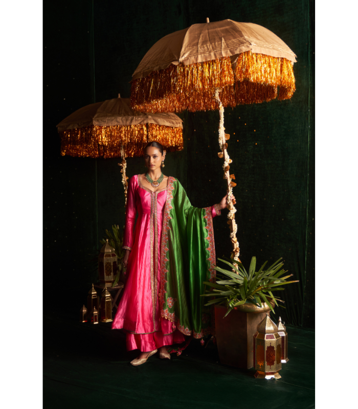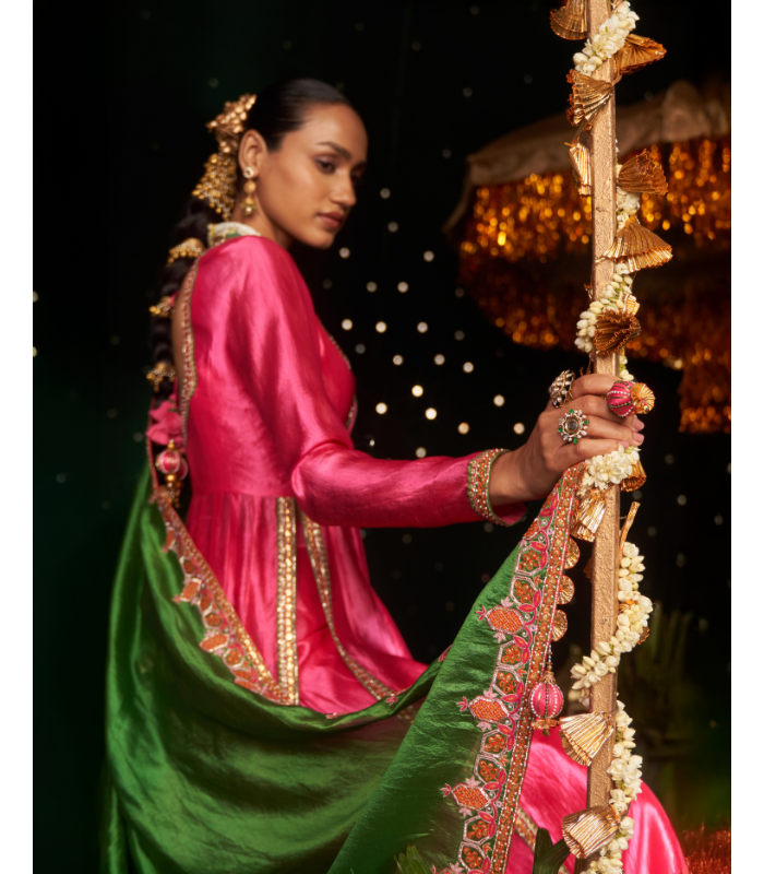 This look features a hot pink silk Anarkali that exudes youthful elegance. The silhouette is enhanced with a flattering V-neckline and intricately embellished front panel, detailed with zardozi work, sequins, and gota lace borders. The outfit is paired with tonal silk pants that add volume and grace to the look. A contrasting green silk dupatta, edged with floral embroidery and scalloped gota lace, adds a striking pop and completes the regal aesthetic. Perfect for weddings, sangeets, or festive gatherings.