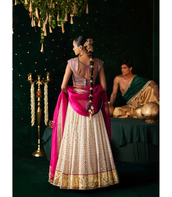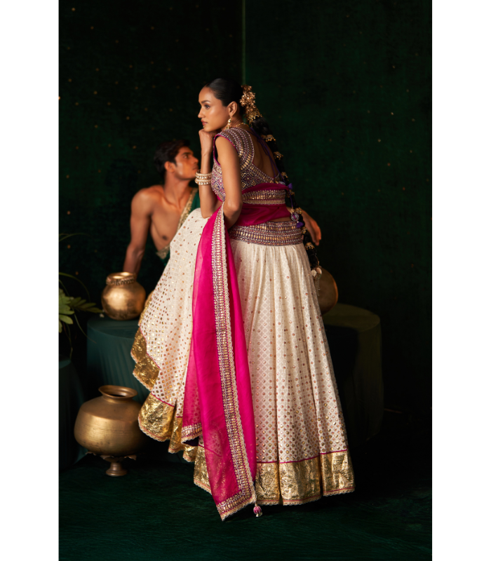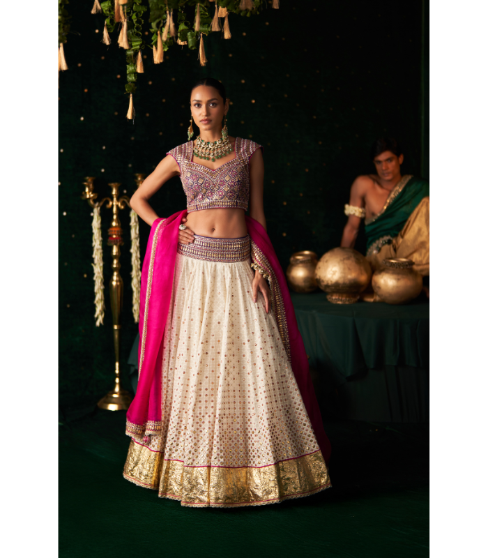 A radiant ivory lehenga set that effortlessly blends traditional charm with a vibrant modern touch. The lehenga is crafted in jacquard fabric, adorned with scattered gota work and finished with a luxurious gold brocade border. The blouse is tailored from intricately embroidered ikkat silk, featuring vibrant mirror and threadwork. Completing the ensemble is a magenta organza dupatta, delicately detailed with a hand-embroidered border, adding grace and finesse to the overall look.